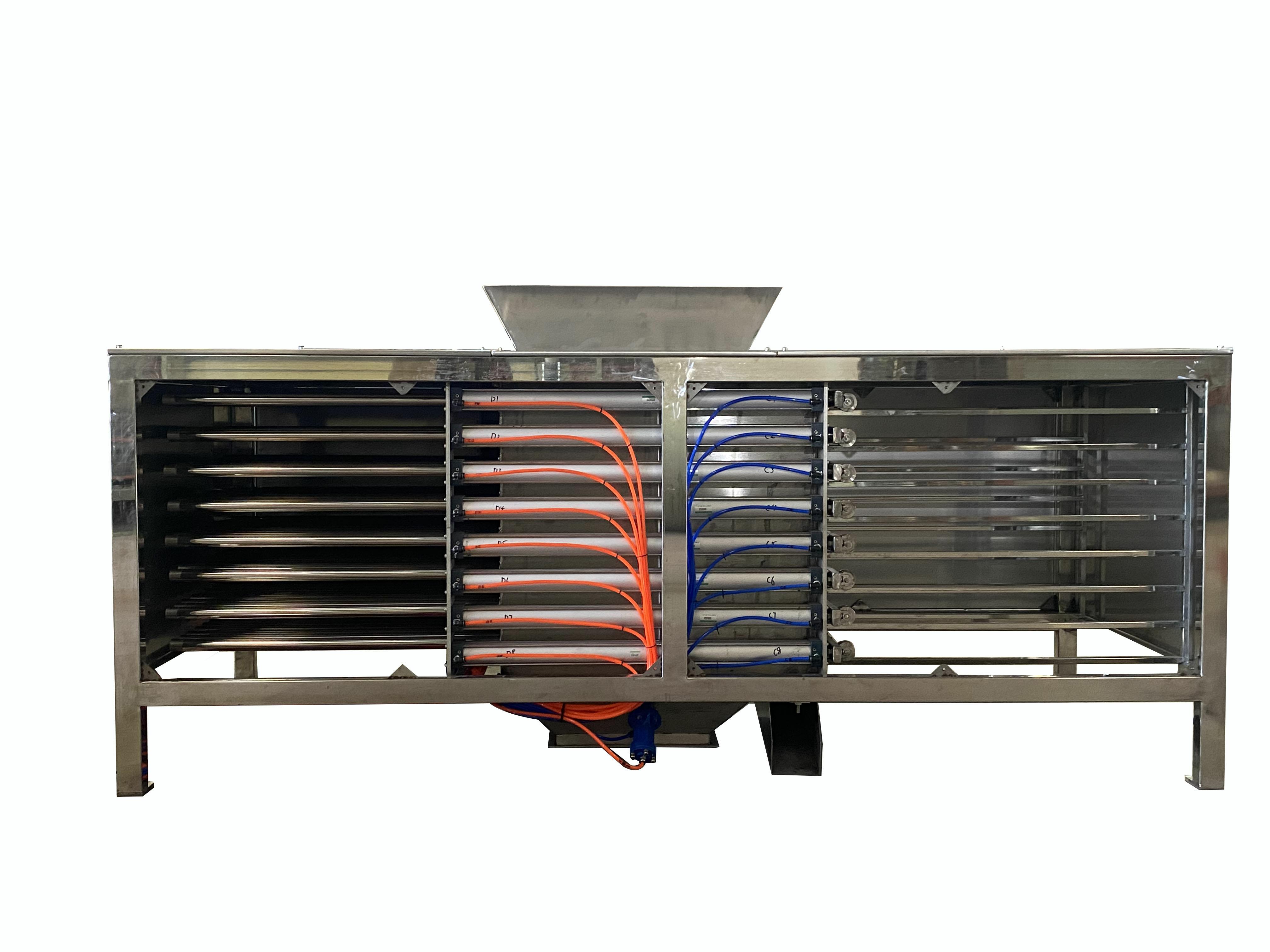 技術特點:磁棒箱的磁棒采用超強的稀土永磁或氧化磁鐵作為磁源,與電磁除鐵機相比可以節(jié)省電耗;利用磁棒超強的磁力分揀出細小鐵雜質,從而起到保護下一選別作業(yè)設備和提高物料純度的作用;較強的磁力強度,直徑25mm的磁棒表面磁場強度可達12000Gs以上;排鐵方便快捷,氣缸逐層拉動磁棒,吸附于磁棒的磁性質自動脫落下來。適應范圍:適用于陶瓷原料,長石、石英、高嶺土等非金屬礦的提純除雜,幫助提升品質。